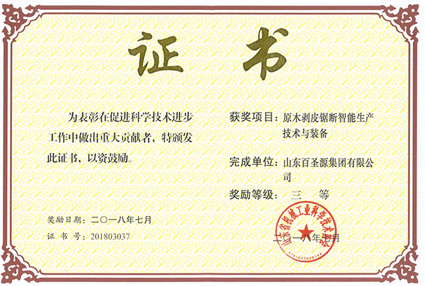 近日,山东省机械工业科学技术协会公布了2018年山东省机械工业科技进步奖名单,我公司自主研发生产的SL2600/5C数控无卡轴旋切机、原木剥皮锯断智能生产技术与装备分获二、三等奖。