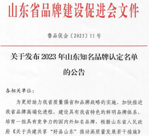 12月5日,山东省品牌建设促进会发布了2023年山东知名品牌名单,我公“BSY”品牌再次入选。